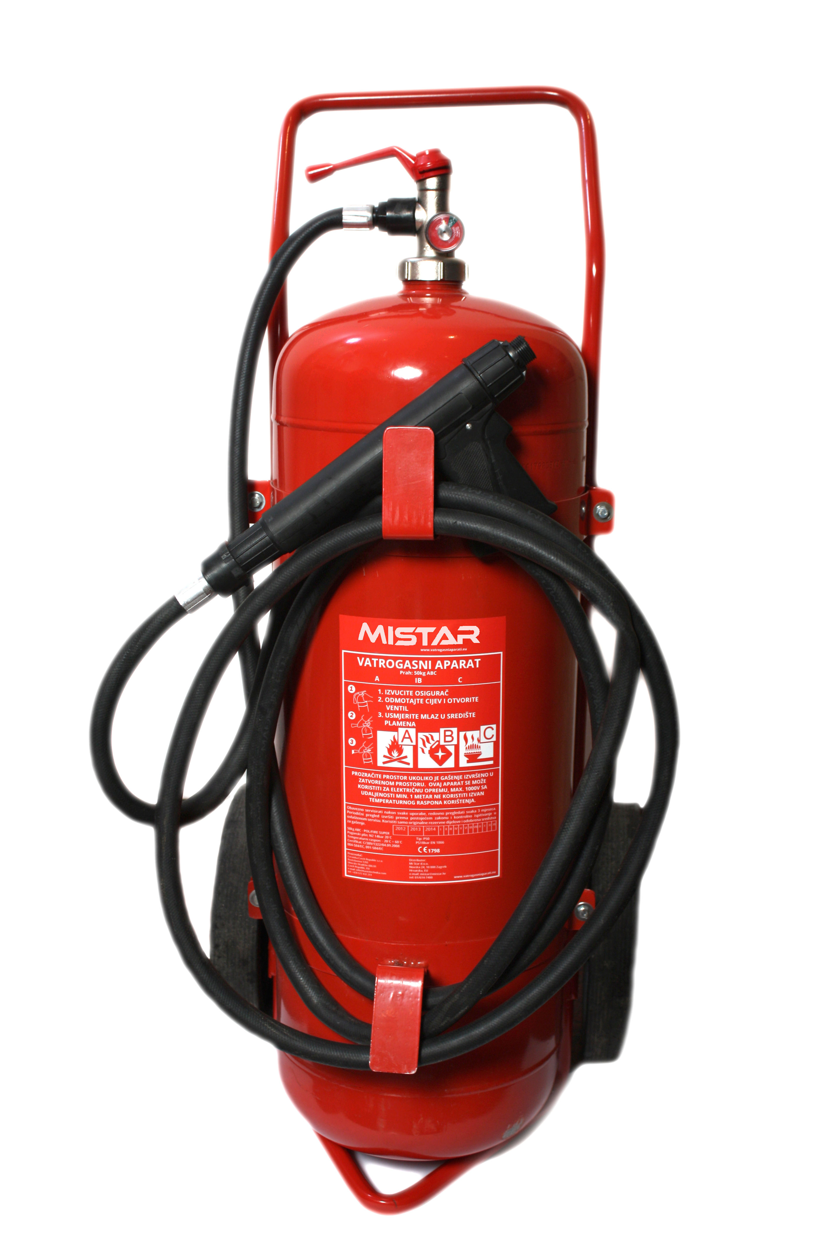 Količina sredstva za gašenje: 50 kgSredstvo za gašenje: ABC prahPogonski plin: dušik (N2), stalni tlakKapacitet gašenja: A IIB CStandardi: EN1866